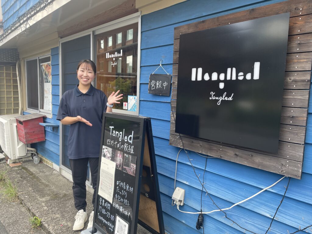 自分が移住して驚いた四万十町内の食材の豊かさ、新鮮さを活かそうと、飲食店のオープンに向けてアイデアを練っていきました。町内産の生姜、ニラ、豚肉を使った「餃子」をメインに、夜の窪川地区のにぎわいの場を目指して2023年9月に餃子屋「Tangled」をオープンしました。
